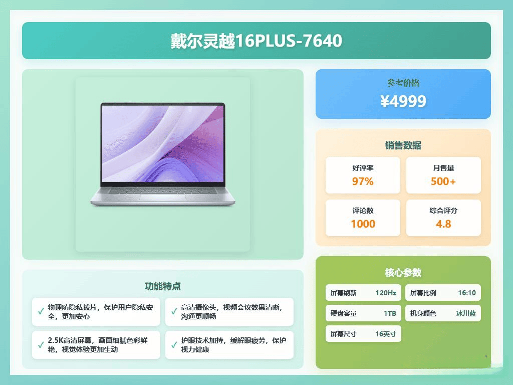 戴尔灵越16PLUS-7640配备了英特尔酷睿i5 210H处置器,全体机能不变正在45W,根基能满脚日常办公、设想以及轻度视频剪辑的需求。16GB LPDDR5X内存和1TB固态硬盘的搭配,确保多使命处置流利同时存储空间丰裕。运转Windows 11家庭版,系统界面简练,适合日常利用。这款笔记本的屏幕采用16英寸16!10比例,分辩率达到2560×1600,支撑120Hz刷新率,画面流利且细腻。屏幕笼盖100% sRGB色域,色彩还原精确,适合需要对图像色彩有必然要求的用户。屏幕还通过硬件级低蓝光、光学滤镜和DC调光三沉护眼手艺,长时间利用眼睛承担根基能节制正在合理范畴内。散热方面搭载“飓风之眼”散热系统,共同fn+T超机能模式,一键激活后能无效维持高机能输出,避免机能因过热而下降。接口丰硕,有4、HDMI 1。4、USB-A和SD卡槽等,满脚多种外设毗连需求。机身设想采用金属材质,厚度节制正在19。75mm摆布,分量正在2公斤内,还配备了带背光的全尺寸键盘,打字体验优良。
