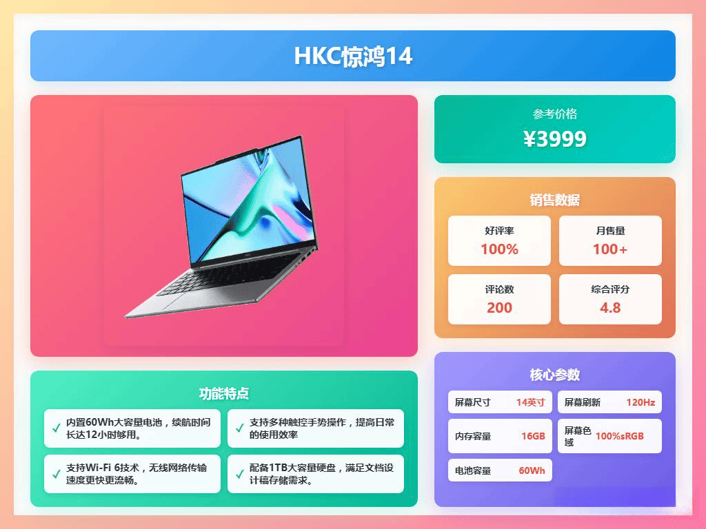 HKC惊鸿14采用了14英寸2。8K高分辩率IPS屏幕,支撑120Hz刷新率和100%sRGB广色域,显示结果细腻又鲜艳。屏幕亮度达到400nits,室表里利用都很不错,超窄边框设想让视觉体验更沉浸,屏占比达到91%。零件分量仅1。09kg,厚度大约15。9mm,机身采用航天级镁铝合金材质,既轻又坚忍,便利随身照顾。内置第13代英特尔酷睿i5-13420H八核处置器共同16GB DDR5高速内存和1TB固态硬盘,日常办公、多使命处置和轻度图片视频编纂都能流利应对。续航表示也相当实正在,配备60Wh大容量电池,能支撑12小时摆布的办公时间,支撑65W快充,充电半小时能弥补约50%的电量。接口方面相当全面,有USB-C、USB-A、HDMI等多种接口,另配备指纹识别和带物理开关的高清摄像头,兼顾了平安和现私需求。